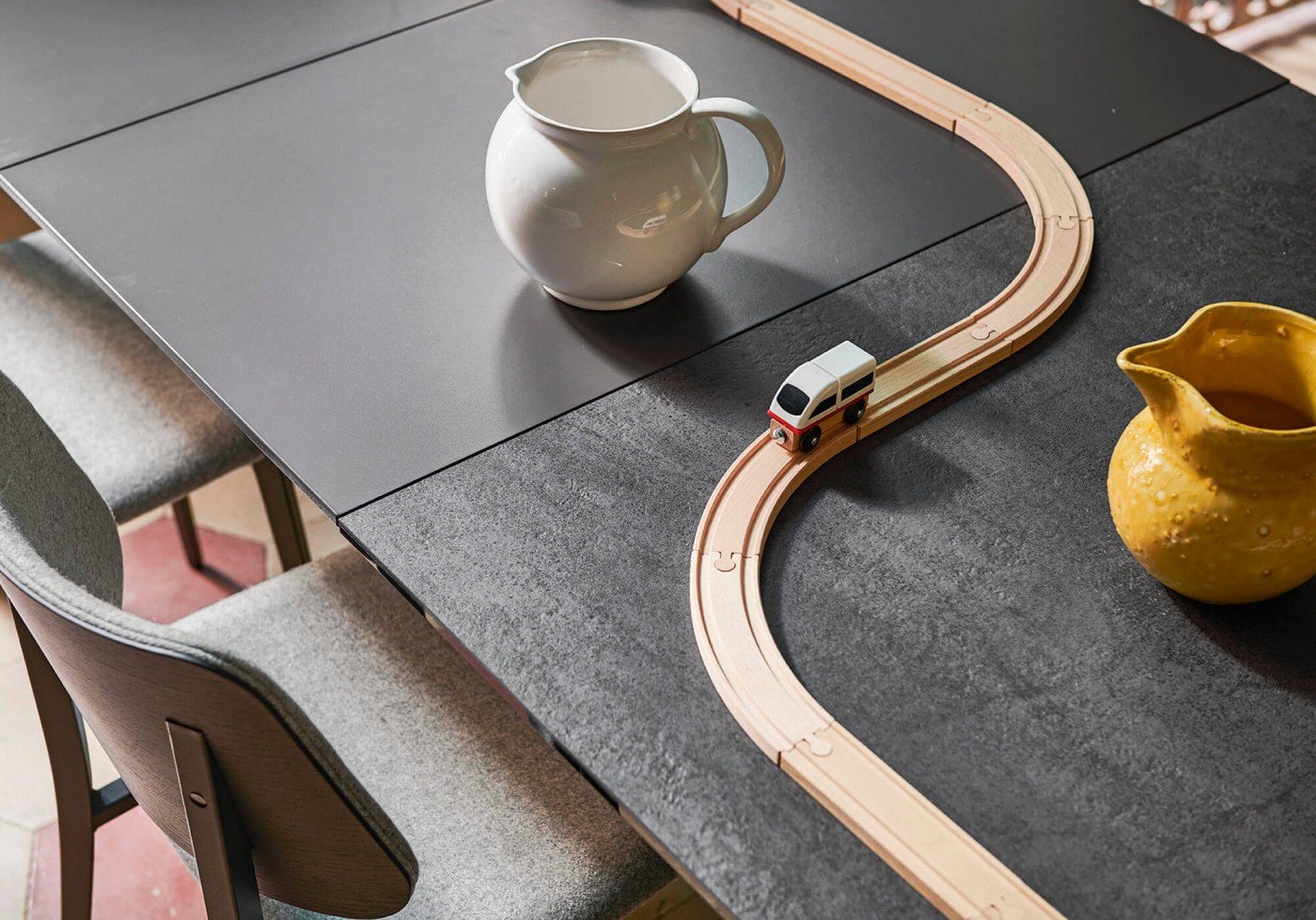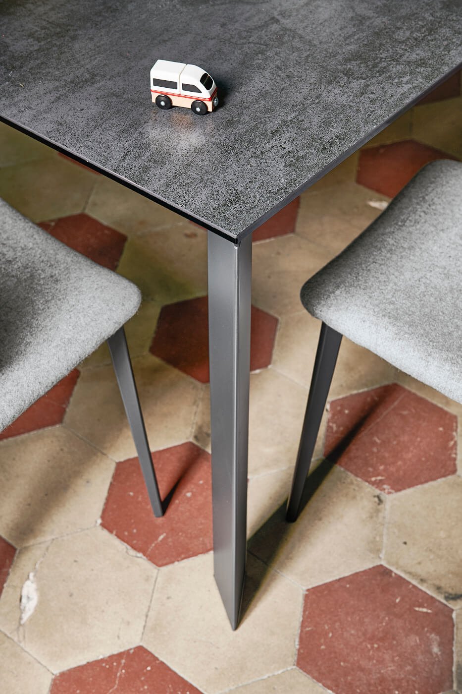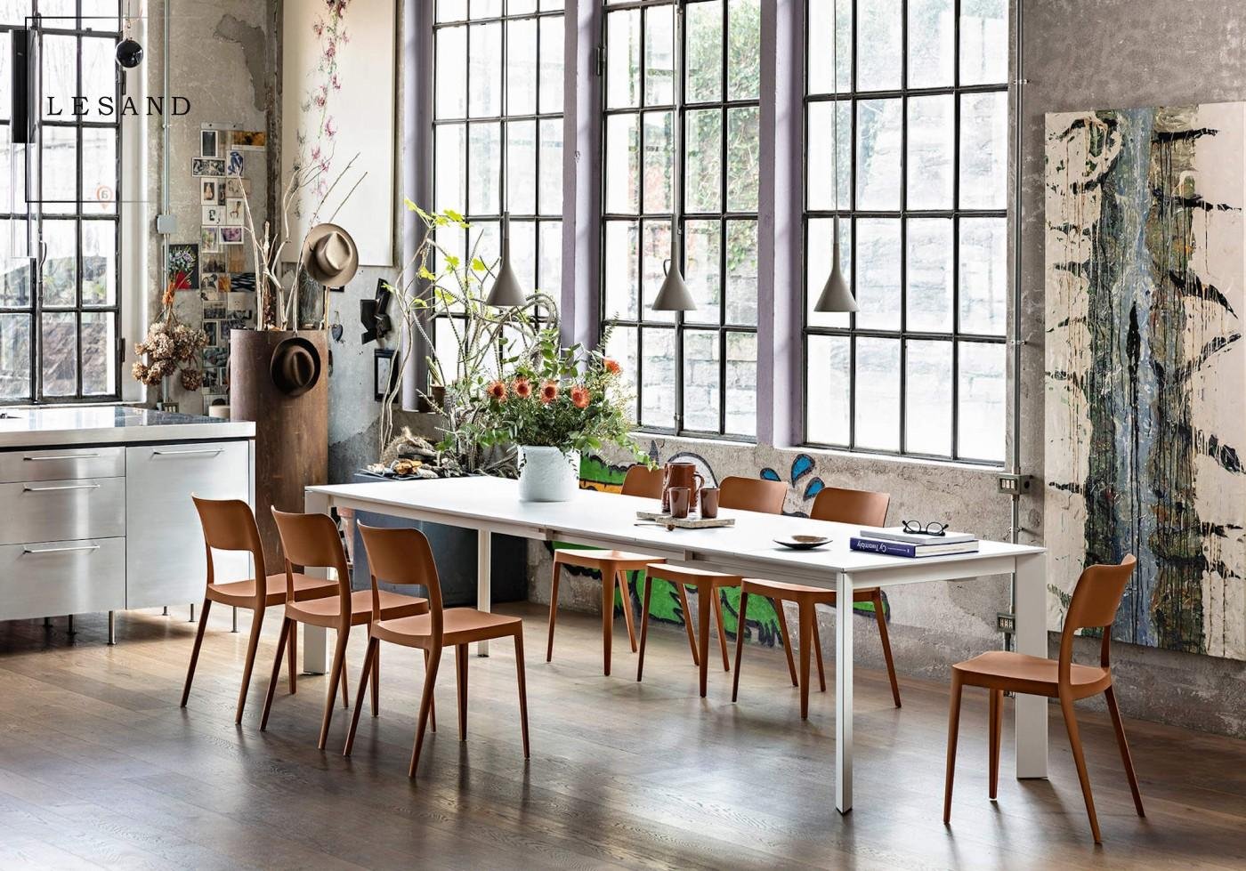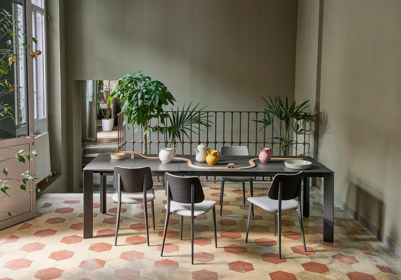 Розкладний стіл Ghedi доступний в різних розмірах. Рамка доступна з лакованої сталі. Верх доступний з меламіну, лакованого МДФ, глянцевого скла, скла проти анти подряпин або кристалокераміки.